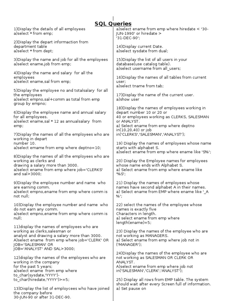 Oracle MOOC: SQL Fundamentals Week 2 You have been hired as a SQL programmer for Acme Corporation. Your assignment is Modify hw2_task2_03.sql to display the last name and salary of employees who earn between $5,000 and $12,000, ... Return Document